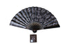 Black hand fan with white patterns on a wooden surface and pink background